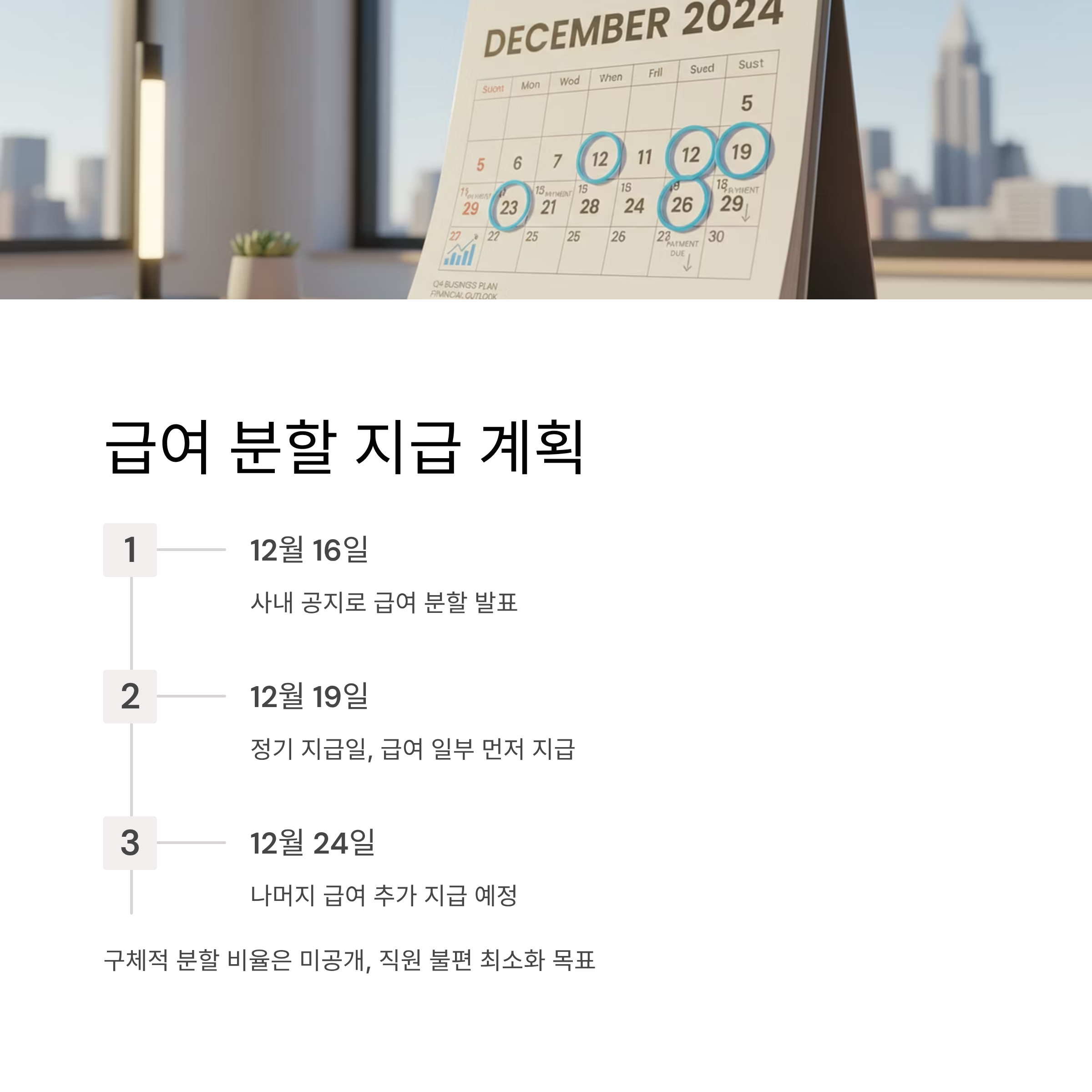 홈플러스 경영진은 16일 '직원 여러분께 드리는 글'이라는 제목의 사내 공지로 '홈플러스 급여 분할' 계획을 명확히 밝혔어요. 12월 급여 중 일부는 정기 지급일인 19일에 먼저 주고, 나머지는 24일에 나눠 지급한다는 거죠. 구체적인 분할 비율은 공개되지 않았지만, 직원 불편 최소화를 위해 최대한 빨리 풀어주겠다는 의지로 보입니다. 경영진은 "지급 불능으로 영업 중단을 막기 위한 유일한 선택"이라며 사과와 이해를 구했어요. 이 홈플러스 급여 분할 방식은 법정관리 중 기업들이 종종 쓰는 임시방편인데, 직원 입장에선 생활비 계획이 틀어지는 큰 충격이에요.