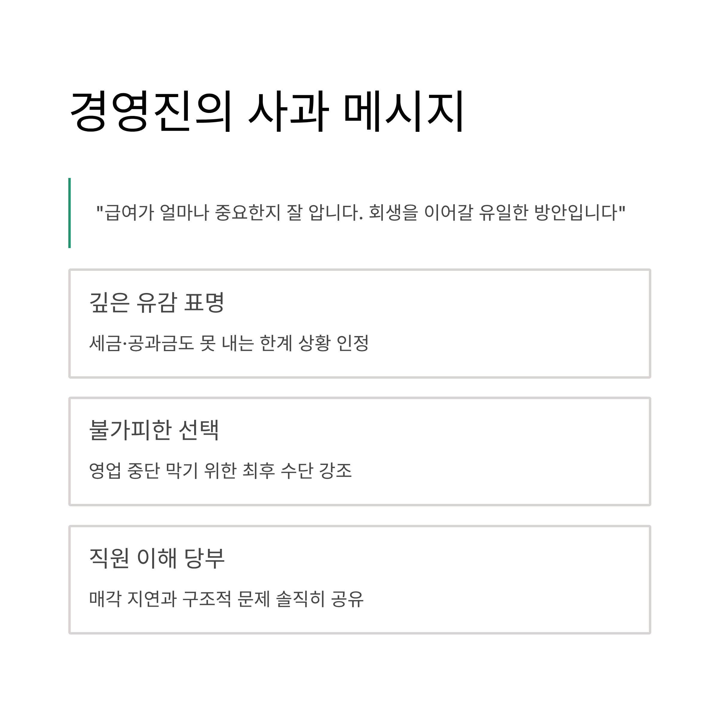 공지문에서 경영진은 "급여가 직원 여러분에게 얼마나 중요한지 잘 안다"며 깊은 유감을 표했어요. "세금·공과금도 못 내는 상황에서 급여만큼은 지켰으나, 이제 한계"라고 솔직히 털어놨죠. 홈플러스 급여 분할을 "회생을 이어갈 유일한 방안"으로 규정하며 직원 이해를 당부한 점이 눈에 띕니다. 이 메시지는 단순 사과를 넘어, 매각 지연과 납품 문제의 구조적 고착을 지적해요. 직원들은 이 말을 어떻게 받아들일지, 노조 반응이 주목돼요. 홈플러스 급여 분할 결정이 경영진의 최후통첩처럼 느껴지는 이유죠.